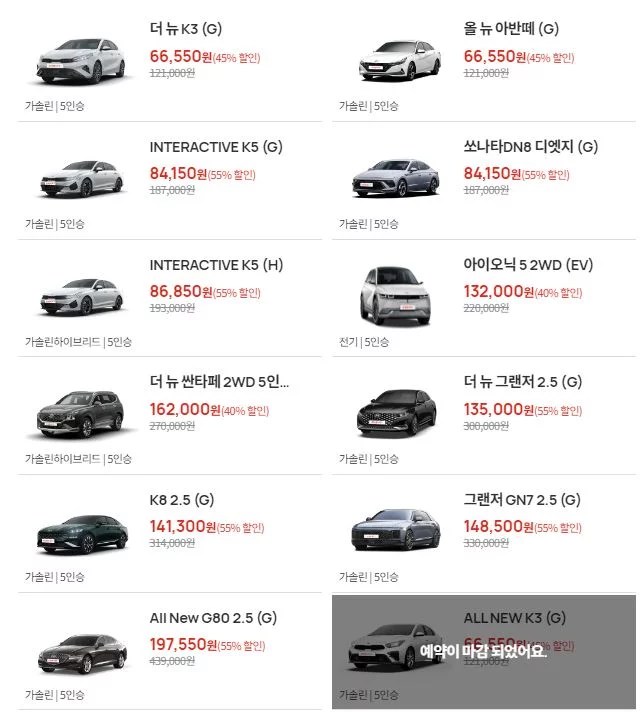 이 글에서 알려드리는 가격은 단기 대여 기준이며 장기 대여 가능한 업체도 있습니다. 24시간 대여시 요금으로 알려드리겠습니다.
