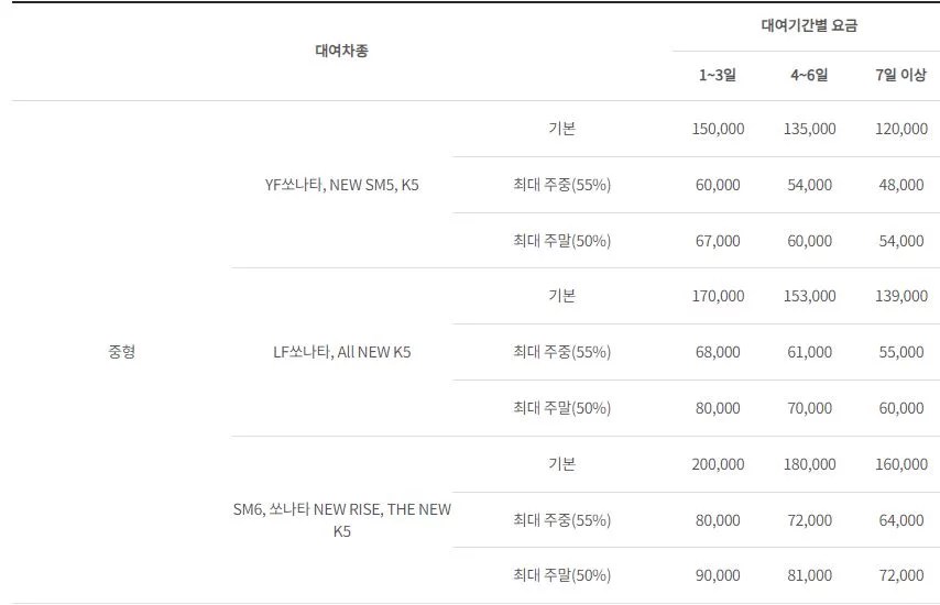 이 글에서 알려드리는 가격은 단기 대여 기준이며 장기 대여 가능한 업체도 있습니다. 24시간 대여시 요금으로 알려드리겠습니다.